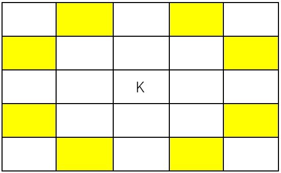 N=5일 때, 나이트가 (3,3)의 위치에 존재한다면 이동 가능한 위치는 다음과 같다. 나이트가 존재하는 위치는 K, 이동 가능한 위치는 노란색으로 표현하였다.