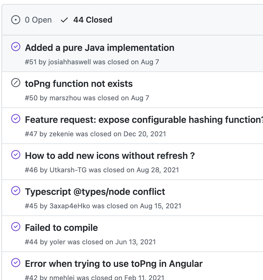 오픈소스인 jdenticon을 github에서 검색하여 issue태그를 살펴보았다. 해결되어 closed되어있는 것들중에 낯이 익은게 있는데
