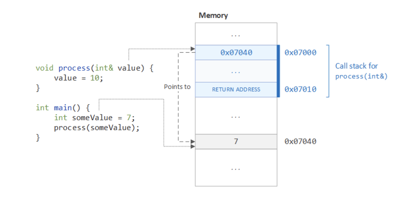 메인 메서드에서 선언한 someValue와 process메서드로 넘어간 value는 서로 다른 스택 영역에 있다. 하지만 process내부에서 someValue의 참조 영역을 pointer로 가리키고 있기 때문에(변수의 레퍼런스 자체를 넘겨주는 것) value의 변화가 someValue에 영향을 계속해서 미치게 된다.